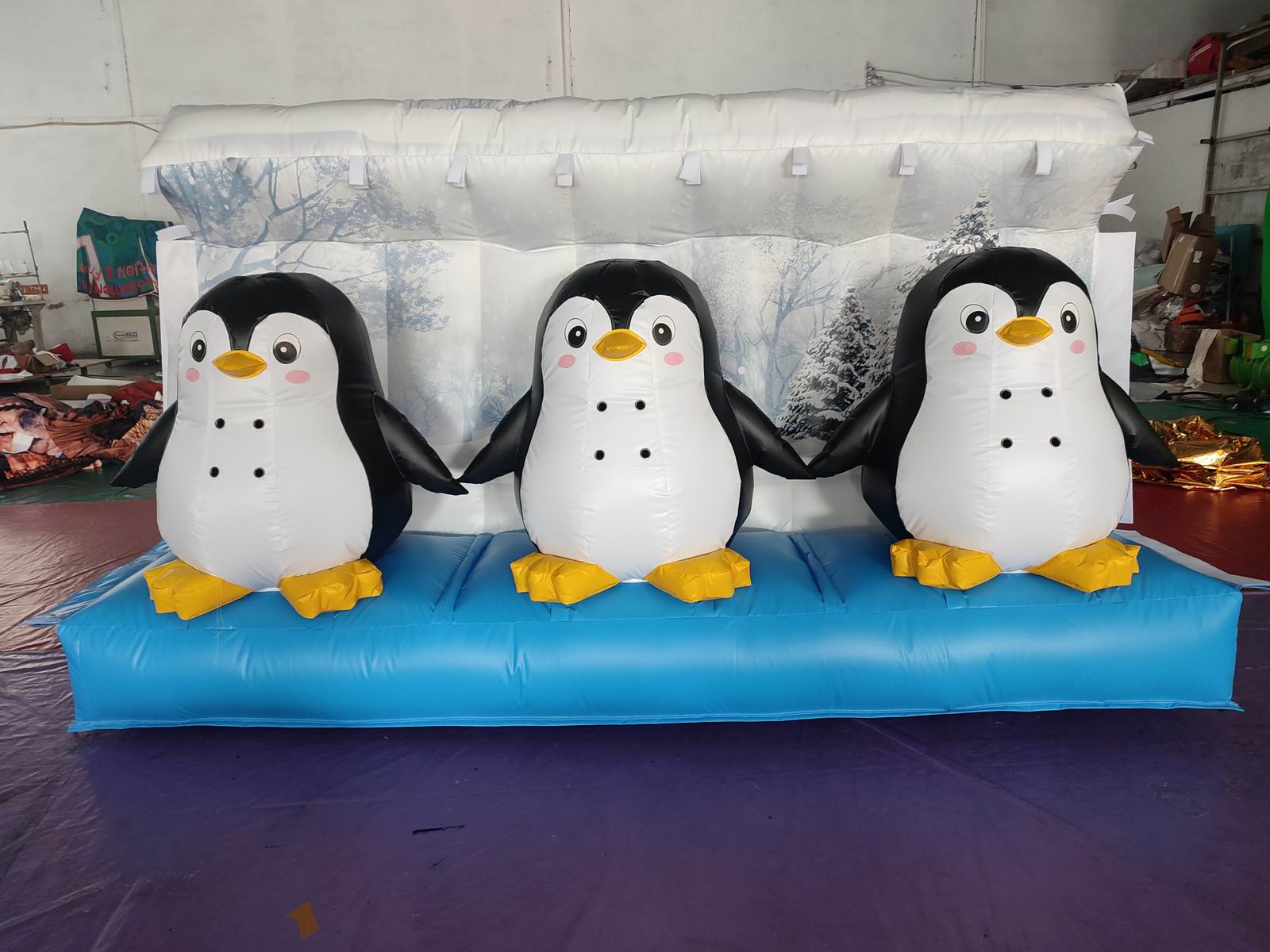 高さ約1.7mの雪山を背景に、3匹のかわいいペンギンが並んだエアー式のミスト機材です。
