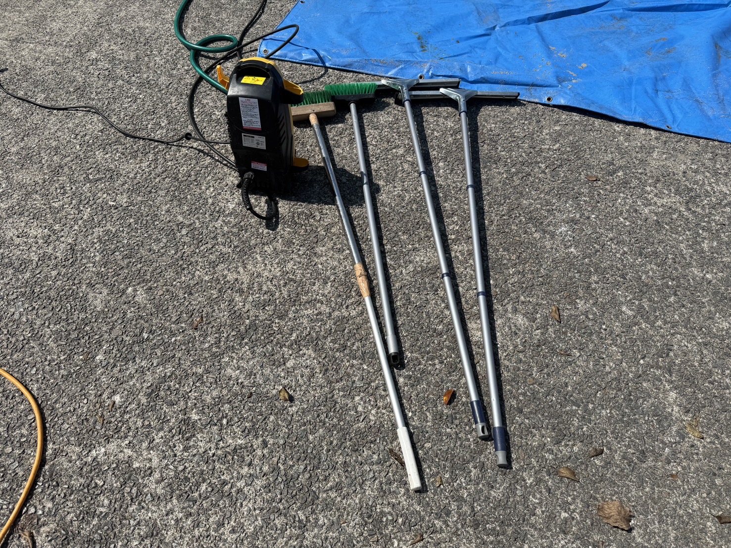 作業中は、高圧洗浄機の水流で砂や汚れをしっかり洗い流し、ブラシを使ってこすり落とすことできれいにします。