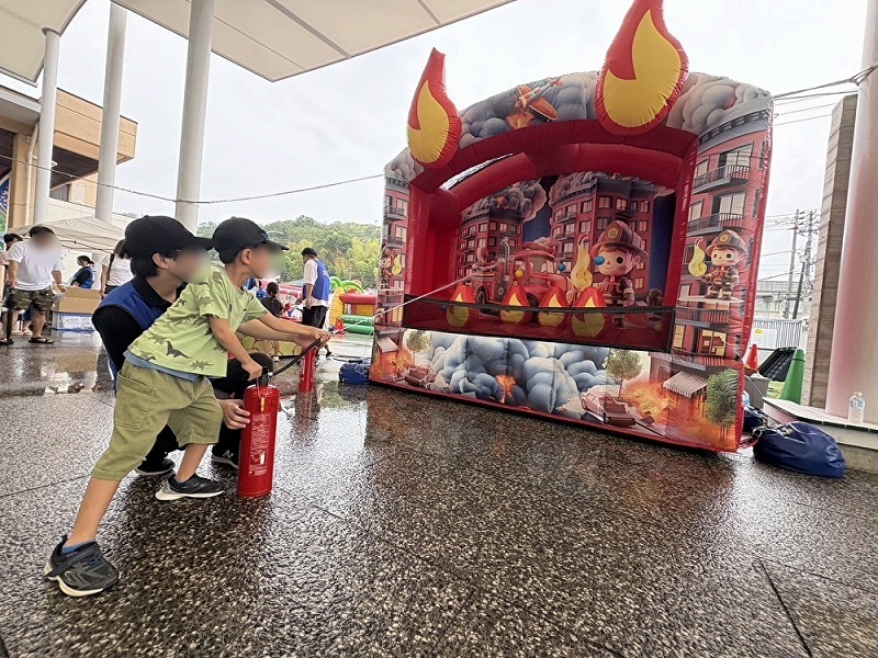 医療用エアーテントを「煙体験ハウス」に活用!消防車遊具と作る防災イベント事例
