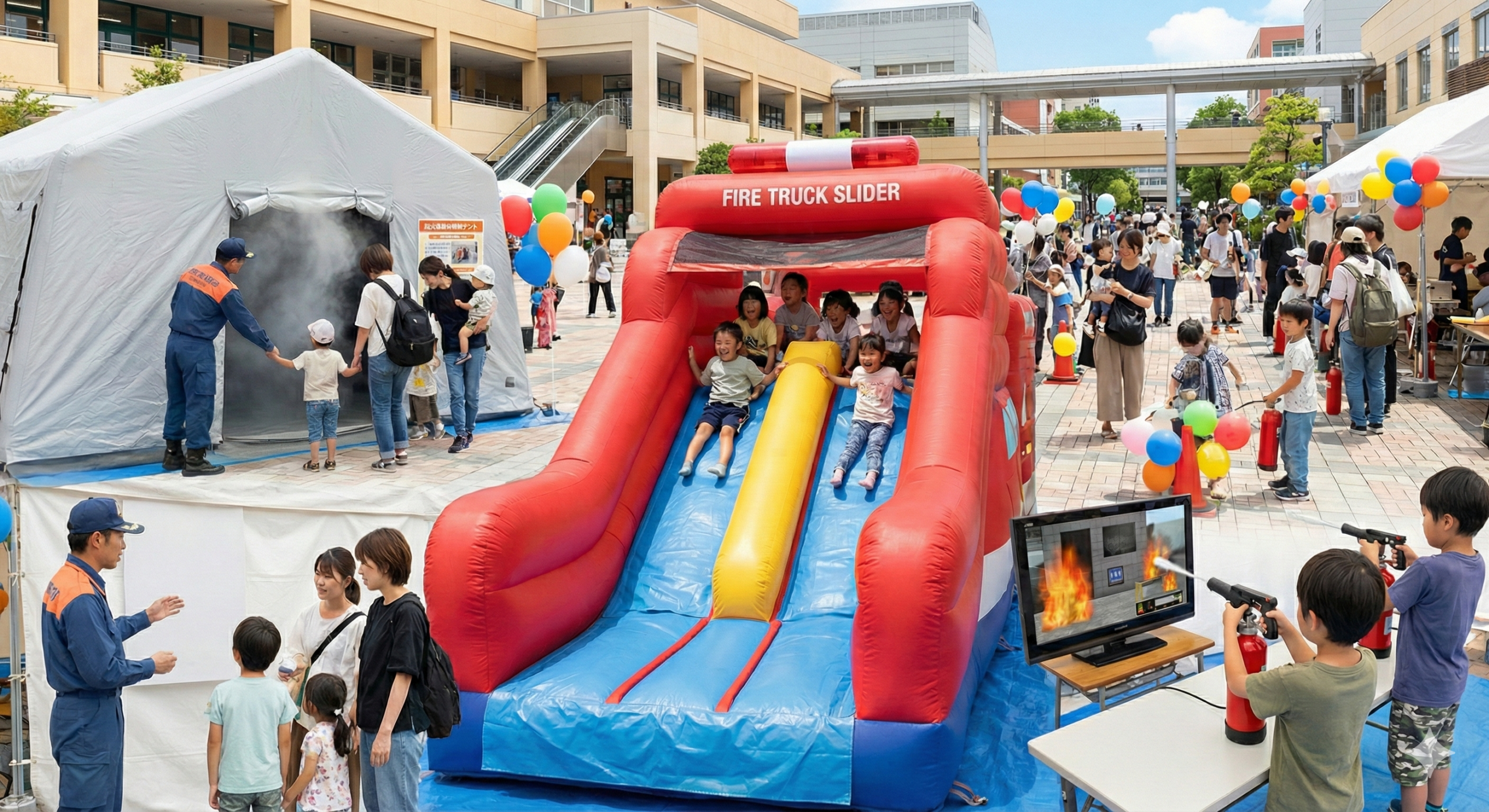 「消防車遊具」などと組み合わせたイベント展開がおすすめです。弊社では、「消防車スライダー」や「消火器訓練ゲーム」などのエア遊具も多数取り扱っています。「遊具で遊ぶ(楽しい)」→「煙体験をする(学ぶ)」という流れを作ることで、ファミリー層の集客効果を高め、楽しみながら防災意識を向上させるイベントが作れます。