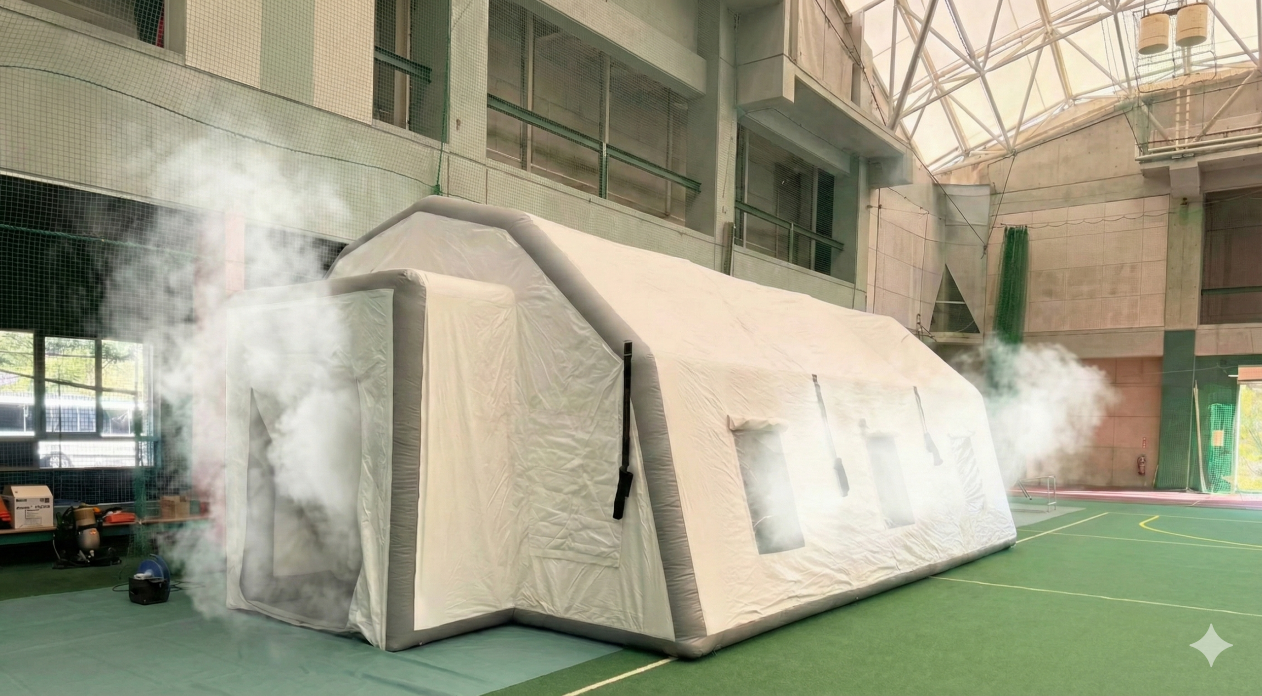 医療用・防災用エアーテントは、災害時だけでなく平時の「煙避難エアテント」としても活用可能です!鹿児島での防災イベント成功事例や、消防車遊具と組み合わせた「学べる・集客できる」イベント企画のヒントをご紹介。スモークマシンのレンタルも対応しています。 -