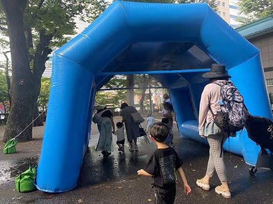 休憩場所としてはもちろん、子どもたちが「涼しい!」とはしゃいで何周も回りながら楽しむ姿が見られました。