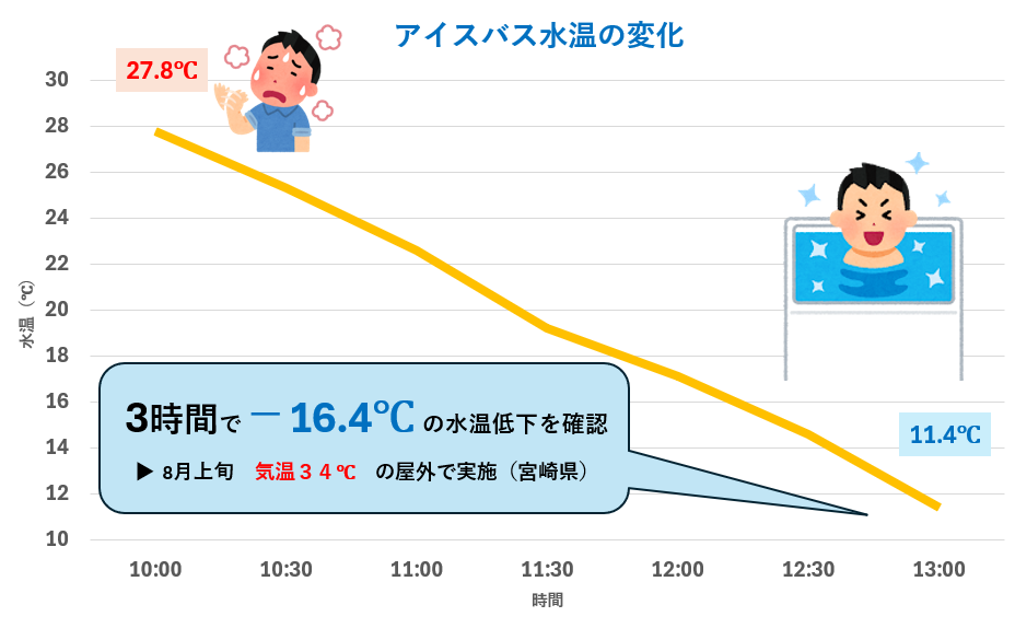 わずか3時間で水温を最大16℃低下させることが可能です(※水温27℃→11℃への低下実証済み)。