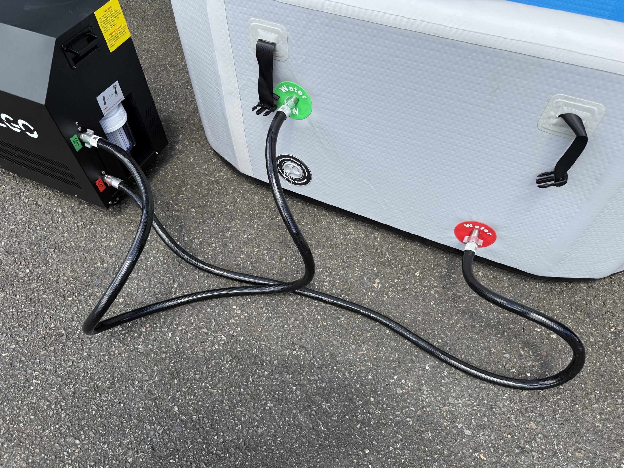 | ①浴槽を広げる | ②冷却装置と浴槽をホースで接続する |