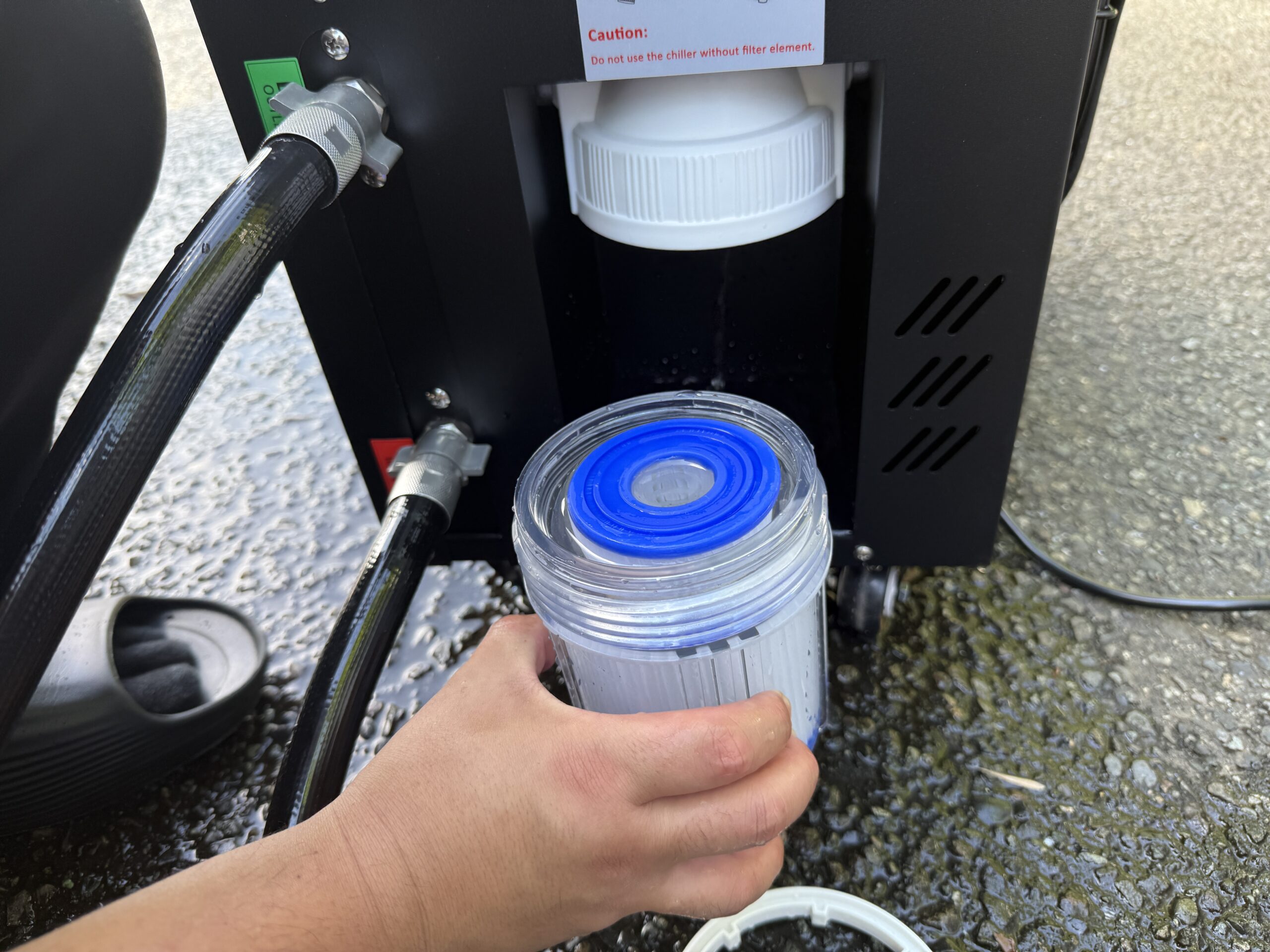 専用の冷却装置(チラー)が水を循環させながら冷却します。